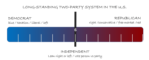 Keeping with this metaphor, if a leader’s position puts them at 5 today and you have historically been between 7 and 8, then that leader, albeit on the blue side of the ruler would be closer to your values than the leader who is on the red side but sitting at 11 on red scale. Your views and Grandad’s were more similar than different because your political values were only a few apart. My political views are more closely represented by any leader who is at or between 4 and 7. I am a registered independent; I got tired of watching the colors get more deep and dark and decided to disassociate with either.